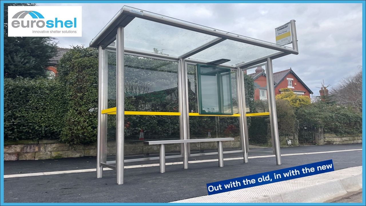 Out with the old Queensbury Shelter and in with the new solar powered Euroshel Invincible Bus Shelter for Cheshire East Council in Congleton, great job and lovely reinstatement work.
